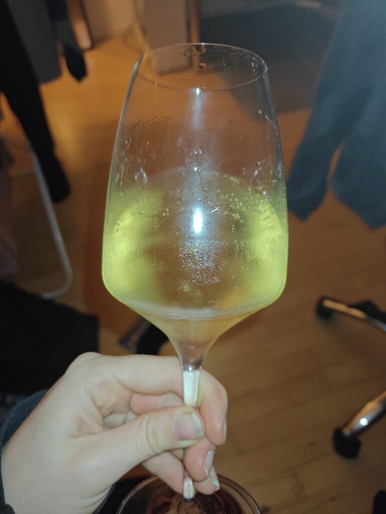 Smagen var jeg desværre heller ikke blæst bag over. Uanset temperaturen var pet natten meget domineret af en overdøvende bitterhed, som jeg syntes der var for meget af. Generelt set har jeg ikke problemer med bitterhed, men her overdøvede den for meget for mig. Ud over det var vinen hovedsaligt præget af limesaft, citronskal og en lidt kalket fornemmelse i munden. Duften matcher i bund og grund smagen ret godt, jeg manglede bare lidt ekstra. Eftersmagen varede ikke ret længe og boblerne var en tak for voldsomme til mig. Alkoholen var super godt integreret og kunne ikke anes. Denne vin kunne godt bruges til sommer, og drikkes koldt på terrassen. Jeg ville ikke anbefale mad til, da jeg er bange for at den vil forsvinde.